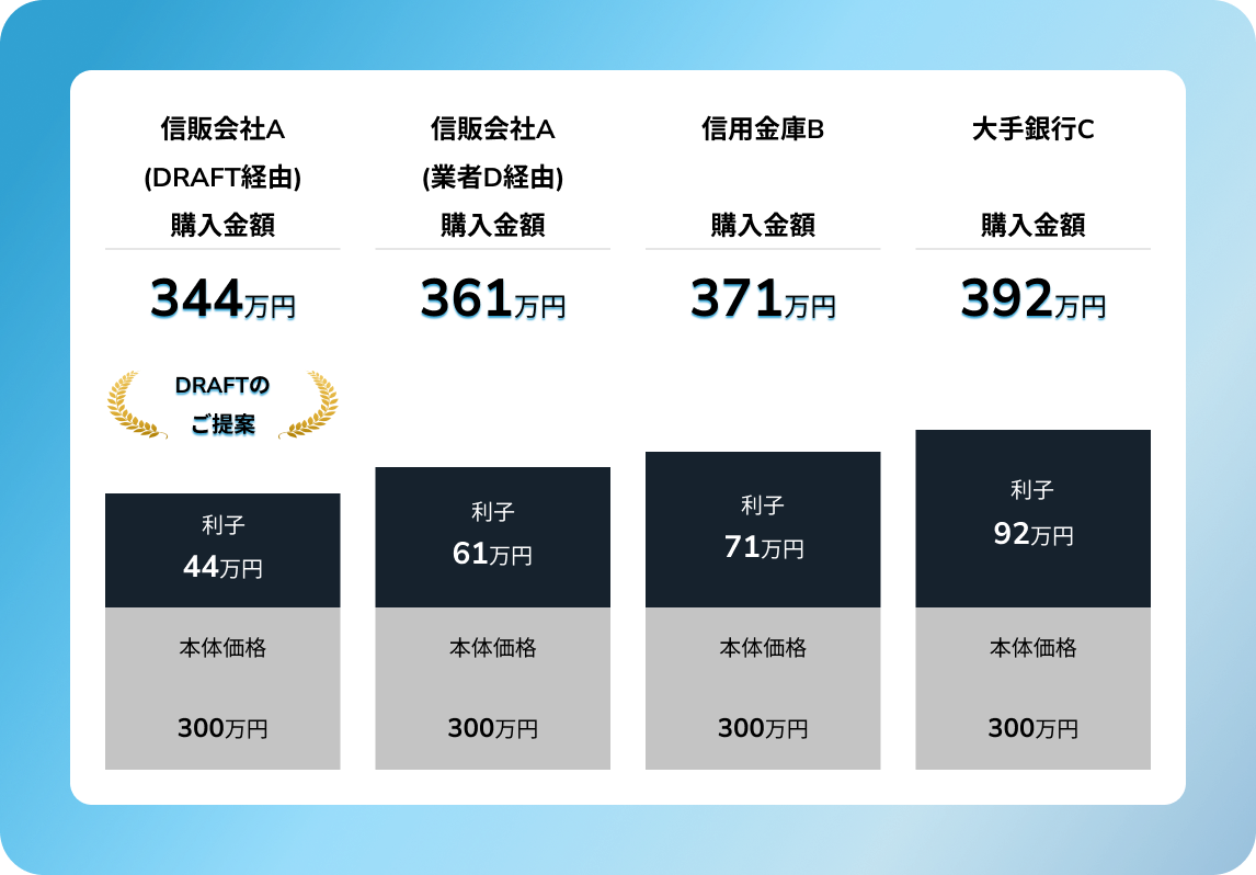 同じローン会社であっても、紹介元である業者との関係性によって、実は金利に差があります。関係性が良好で、優遇されている業者であれば、自信をもって利息を含めたトータルの支払金額をきちんと提示することが可能です。一方、トータルの支払金額を提示できない企業には注意が必要です。