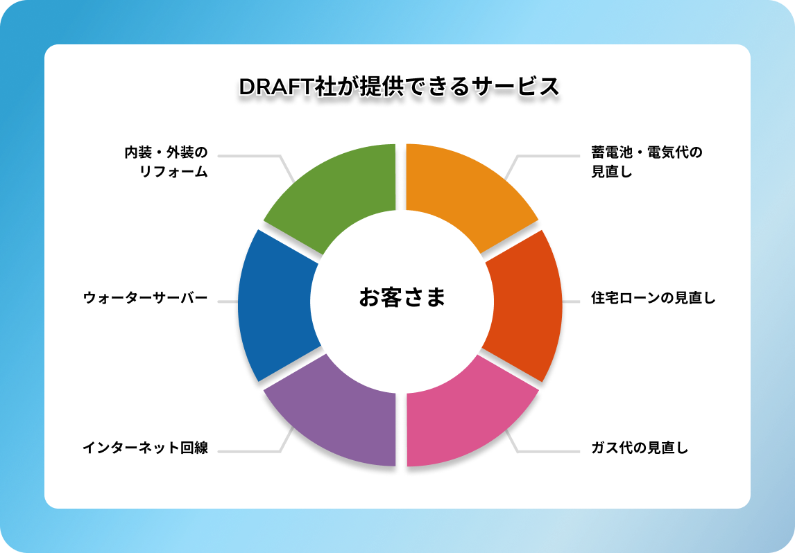 電気ガスなどのライフライン関連の料金、住宅ローンの見直しも可能です。加えて、内装や外装のリーフォーム、インターネット回線やウォーターサーバーなど住宅に関するサポートも可能です。